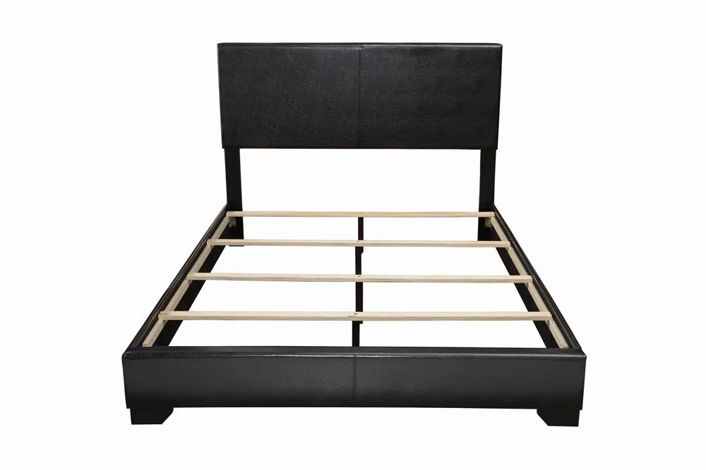 From the Conner collection comes this sleek, contemporary styled bed. It features straight lines and crisp edges for a look that's smooth and effortless. The bed is expertly upholstered in sumptuous leatherette for a handsome appeal. It features stout solid wood legs for long-lasting durability and styling. This bed imparts a mellow yet classy look to the bedroom.
