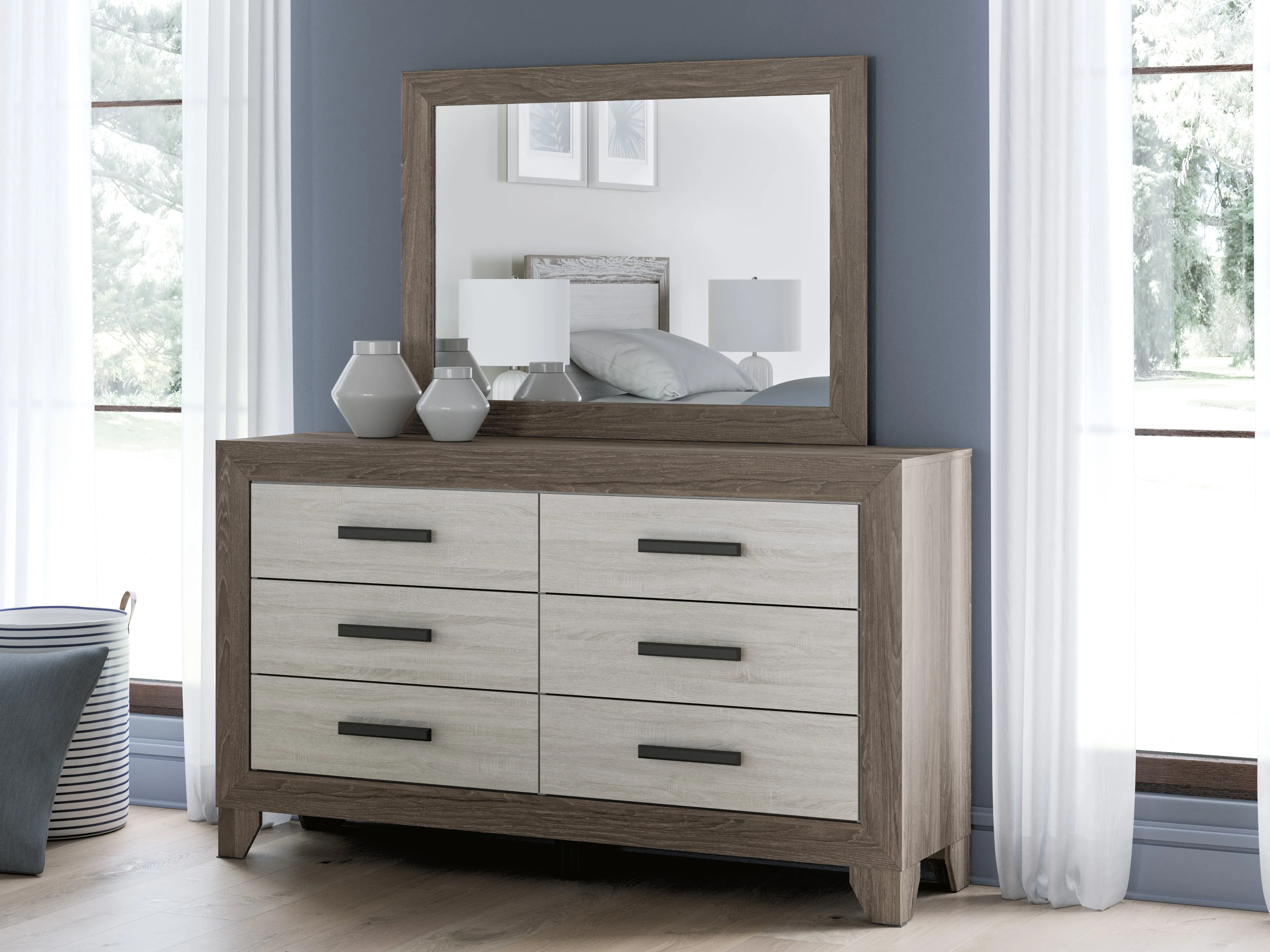 The Dresser and Mirror combination anchors the room with six spacious drawers and a matching framed mirror that reflects light and style. The Chest of Drawers adds vertical storage with five deep drawers, ideal for organizing wardrobe essentials without overwhelming the space.