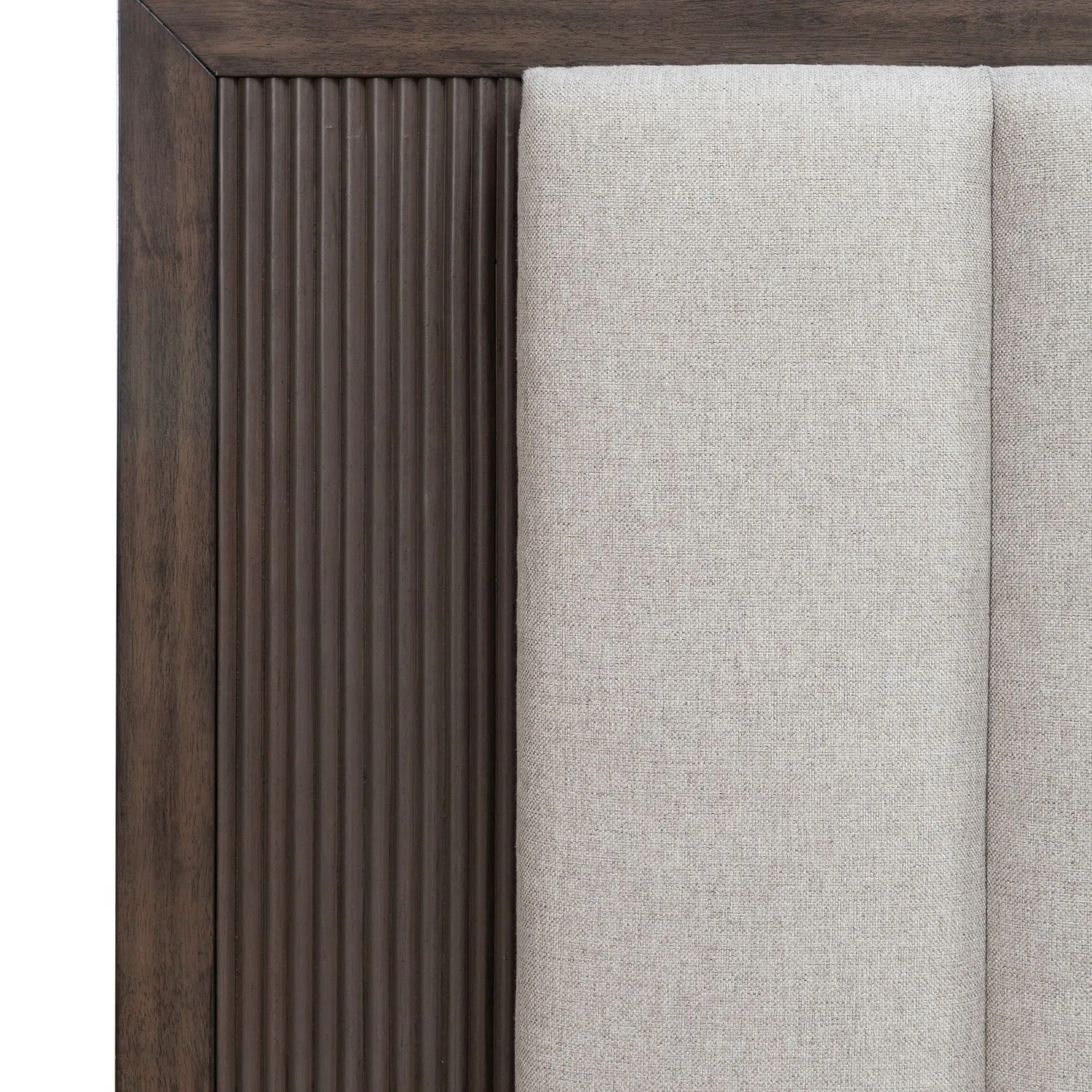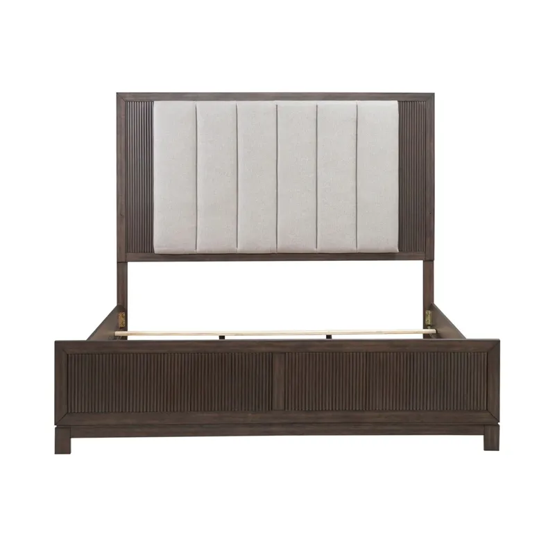 The Modern Edge king upholstered bed is a harmonious blend of classic elegance and contemporary flair, adding a touch of sophistication to your sleep space. Crafted with excellence using Rubberwood solids and Melamine, this bed features a Caffe finish. At the heart of this bed lies its wide picture frame molding, which frames it with timeless charm. The headboard and footboard feature reeded panels that add texture and visual interest, elevating the beds design to new heights. The focal point of the headboard is its channeled upholstered panels, upholstered in a luxurious Textured Gray fabric. The plush upholstery not only provides comfort for leaning back while reading or watching TV but also adds warmth and softness to your bedroom decor. Transform your bedroom into a haven of style and comfort with the Modern Edge king upholstered bed, where classic elegance meets contemporary design for a truly unforgettable look.