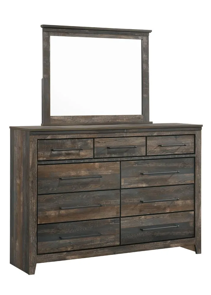 Cozy with a hint of cabin-esque flair, this nine-drawer dresser is ready to organize your sleeping space. Its rustic style is enhanced with a weathered brown finish that adds warmth and aesthetic allure. Extra-long bar pulls, finished in dark bronze, create a sleek and stunning detail. Keep jewelry and delicate items safe within the felt-lined top drawer. This durable piece is made from 3D paper veneer.