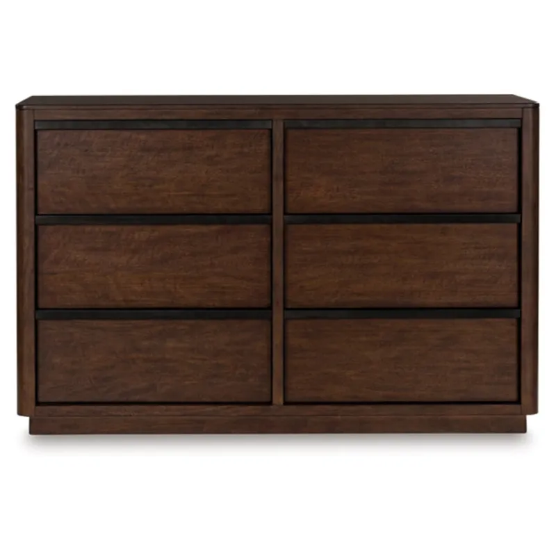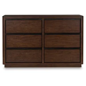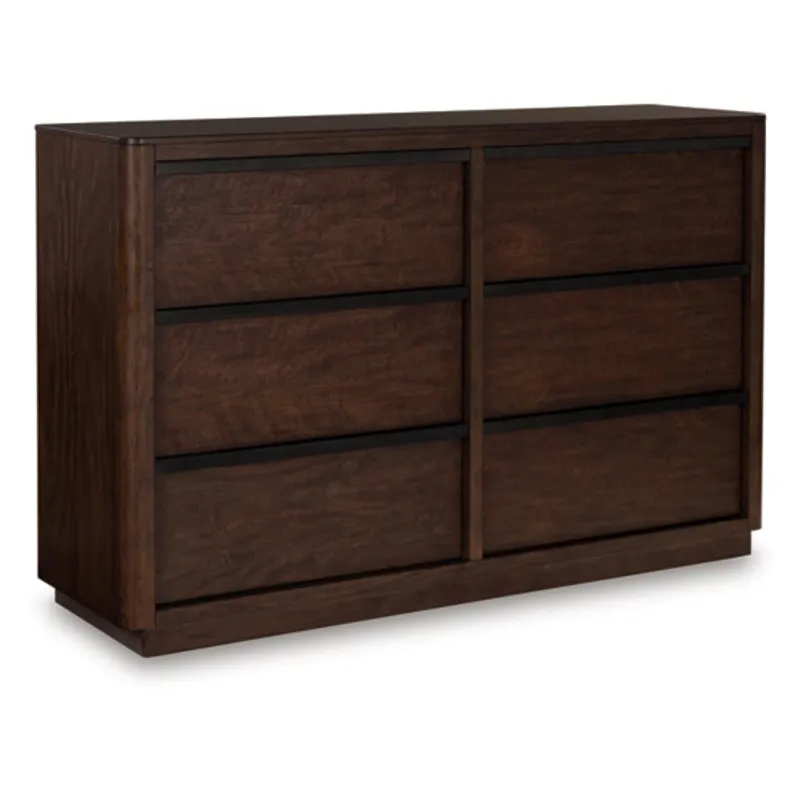 Casual contemporary styling with a decidedly modern vibe. This dresser is warm and inviting with a rich dark brown finish, adorning your restful retreat with on-trend elegance. Full-length metal pulls in a matte black finish add a subtly cool touch to spacious storage drawers. What a simply stunning way to achieve the bedroom of your dreams.