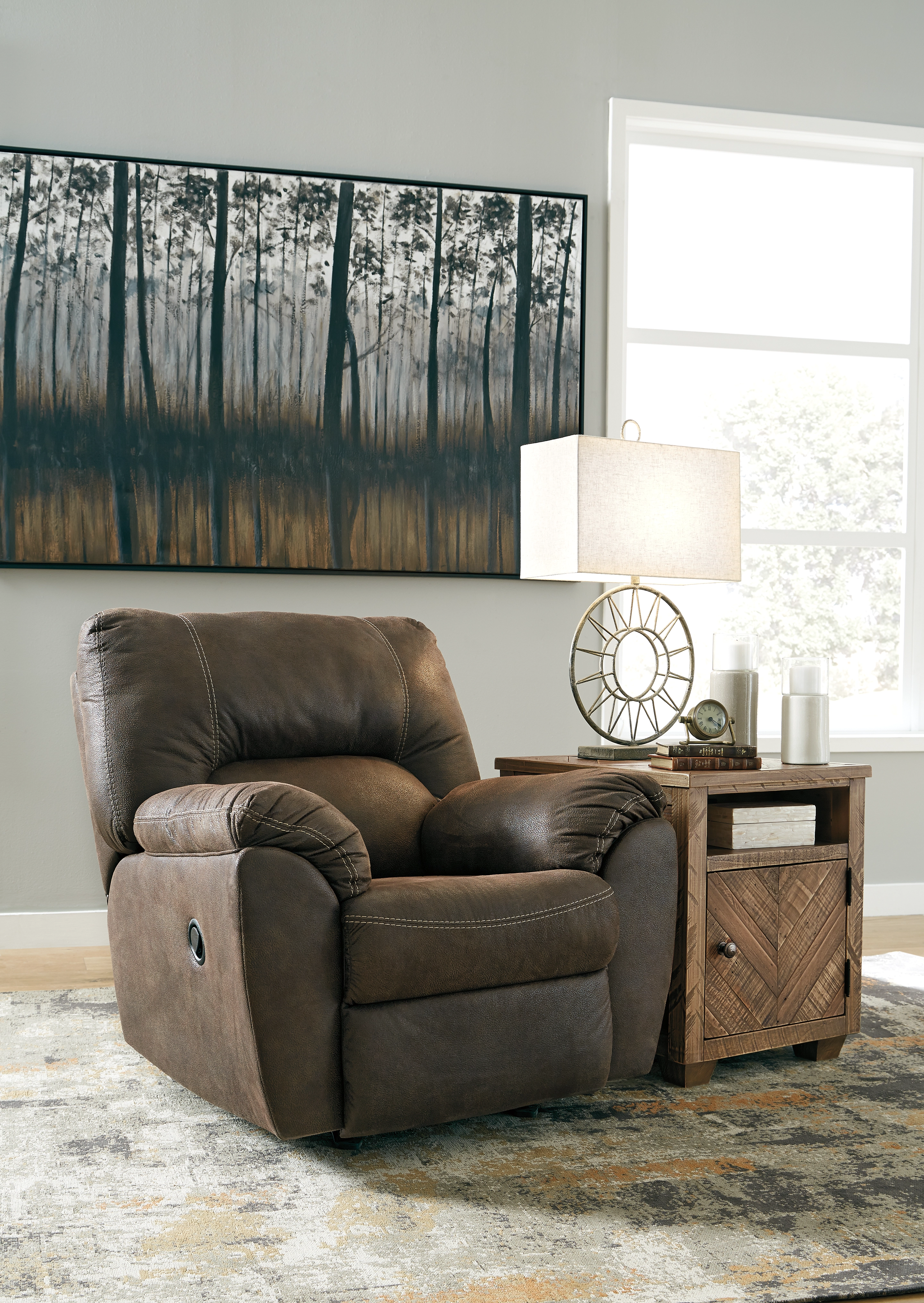 With plush cushions and wraparound pillow top arms, this seating package takes comfort to a whole new level. Faux vintage leather requires minimal care, making this relaxation station ideal in homes with children and pets. And the set’s reclining feature engages with the pull of a tab, putting pleasure at your fingertips.