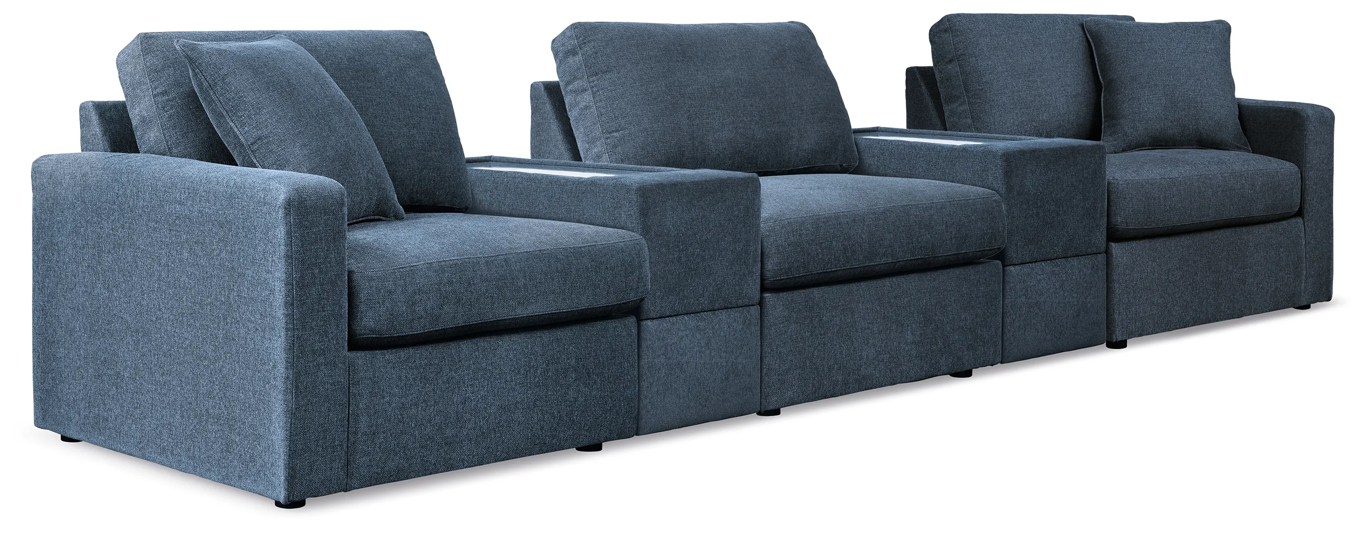 Includes 5 modular pieces: left-arm facing corner chair, armless chair, 2 consoles with storage and right-arm facing corner chair