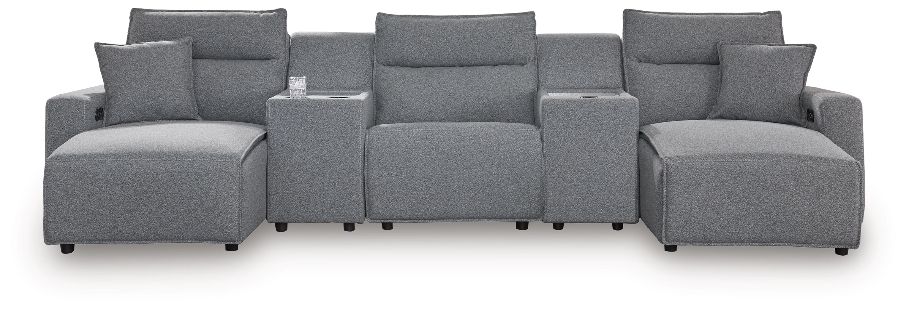 Includes 5 modular pieces: left-arm facing power reclining back chaise, armless chair, 2 consoles and right-arm facing power reclining back chaise