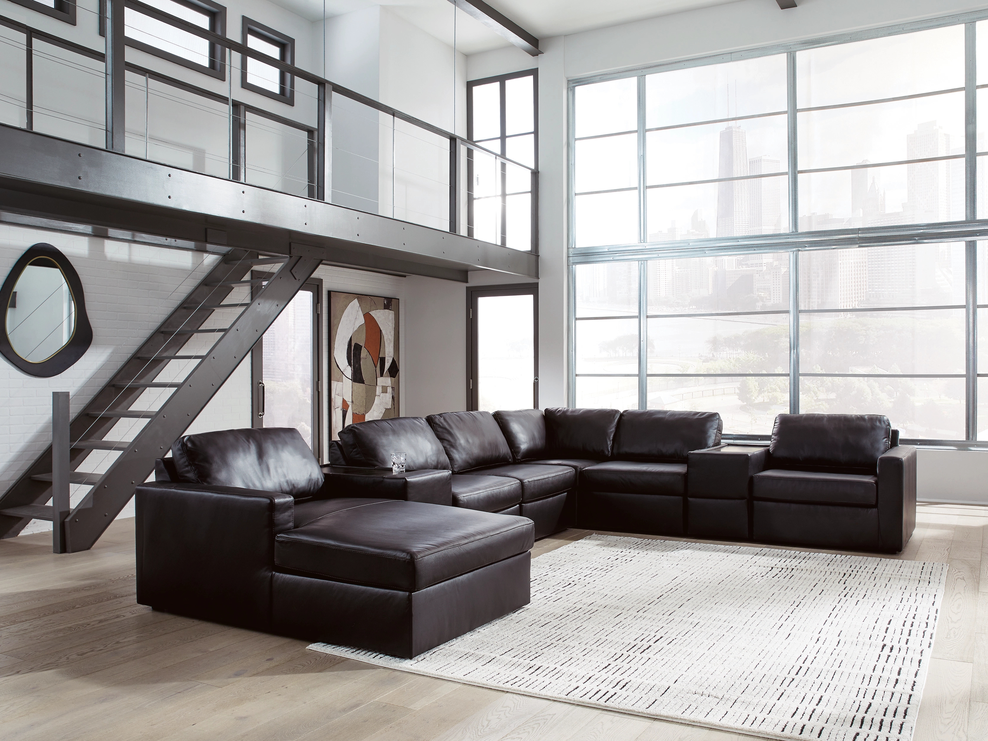 Includes 8 modular pieces: left-arm facing corner chaise, wedge, 3 armless chairs, 2 consoles with storage and right-arm facing corner chair