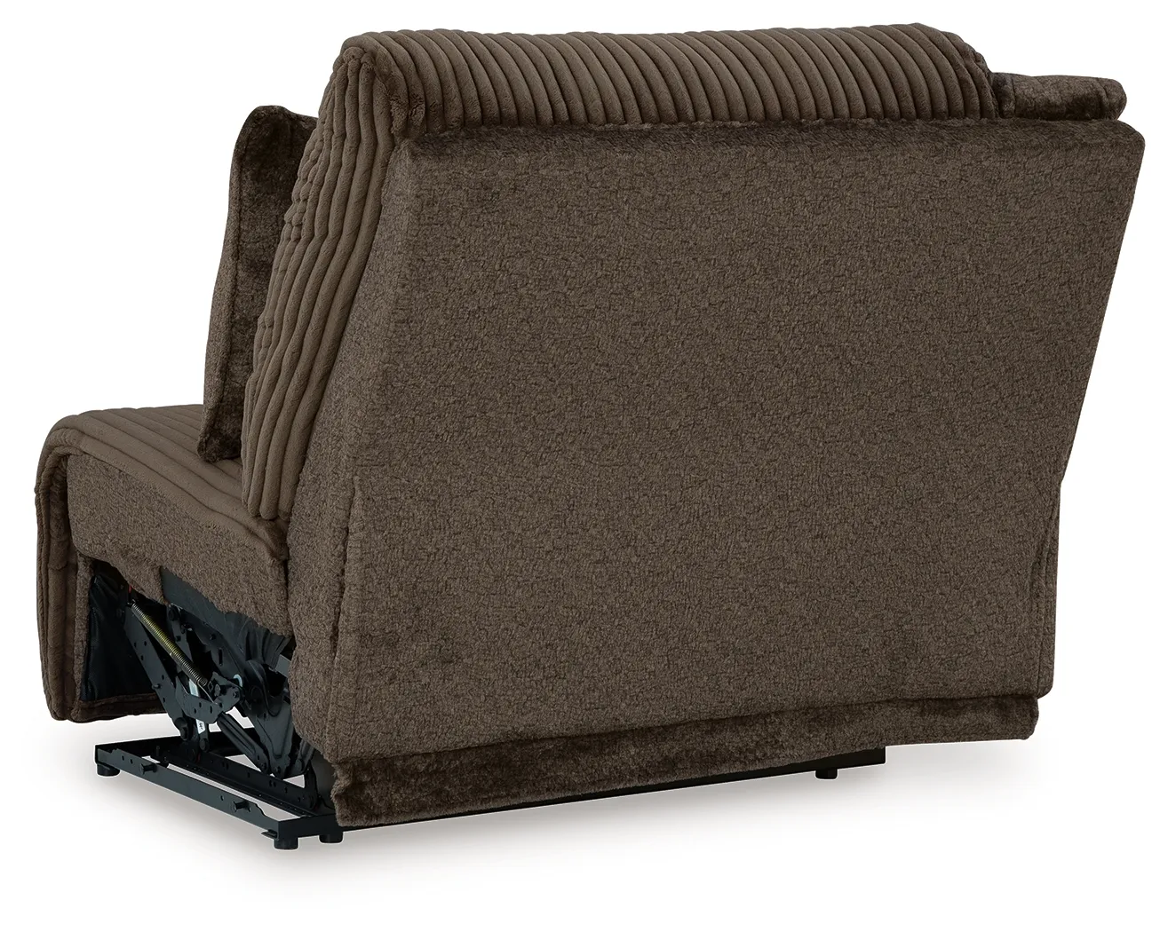 Includes 3 pieces: right-arm facing press back chaise, armless recliner and left-arm facing recliner