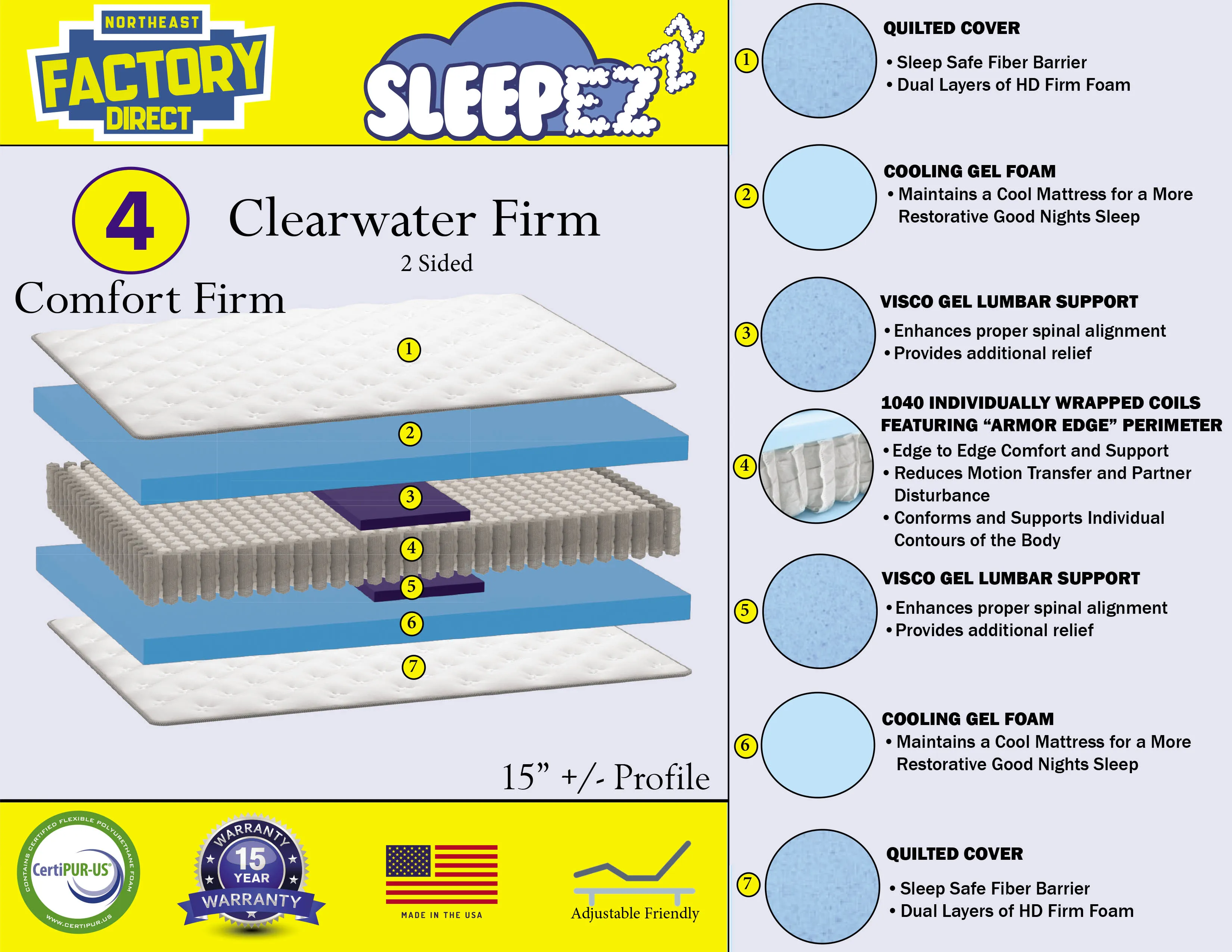 A specialized Visco Gel Lumbar Support layer enhances proper spinal alignment while providing additional lower‑back relief. This targeted support promotes healthy posture and makes the Clearwater Firm an excellent choice for back and stomach sleepers or anyone who prefers a firmer, more supportive sleep surface.