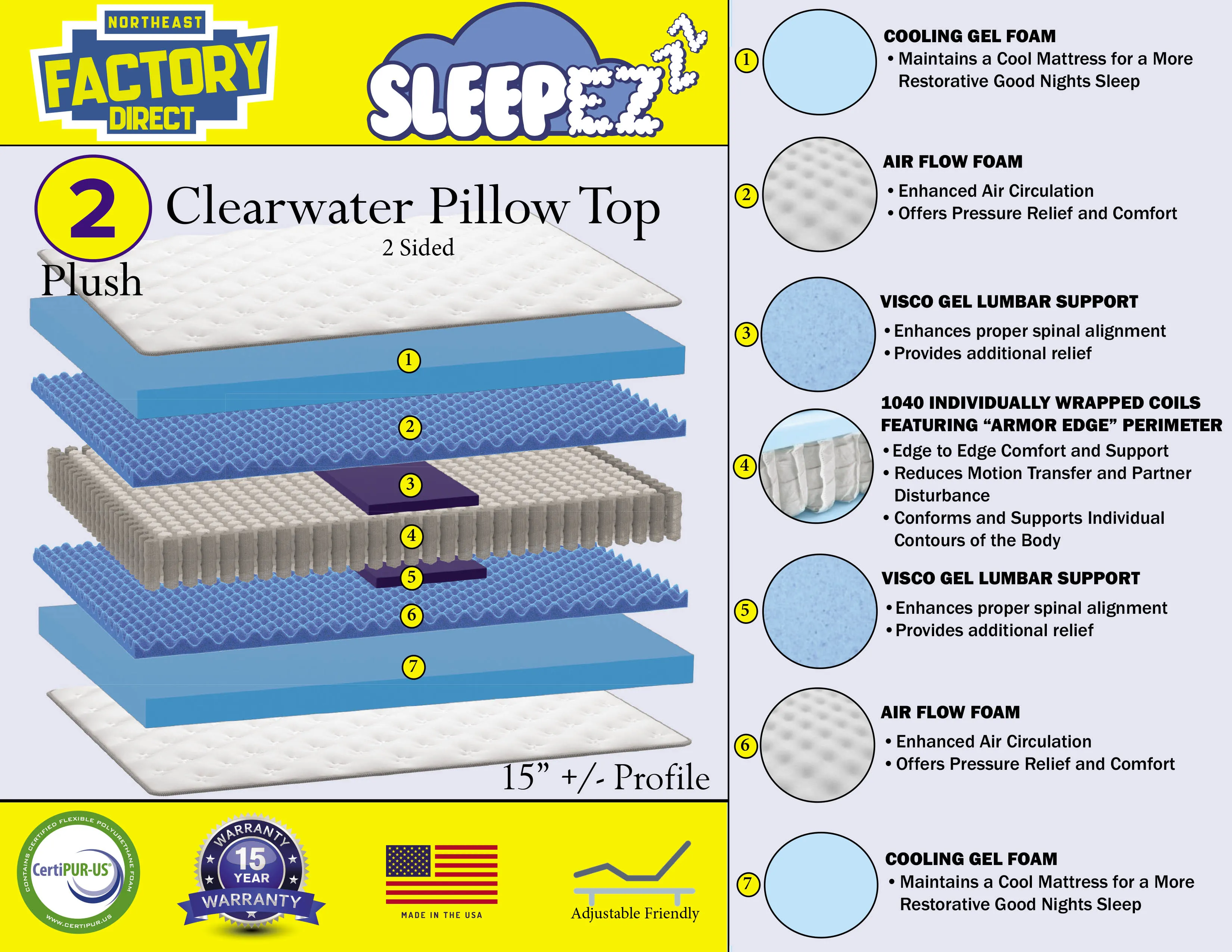 The Clearwater Pillow Top Mattress delivers luxurious plush comfort with advanced cooling and long‑lasting support. Featuring a generous 15” profile, a two‑sided design, and adjustable‑base friendly construction, this mattress is built for sleepers who want soft comfort, durability, and all‑night temperature control.