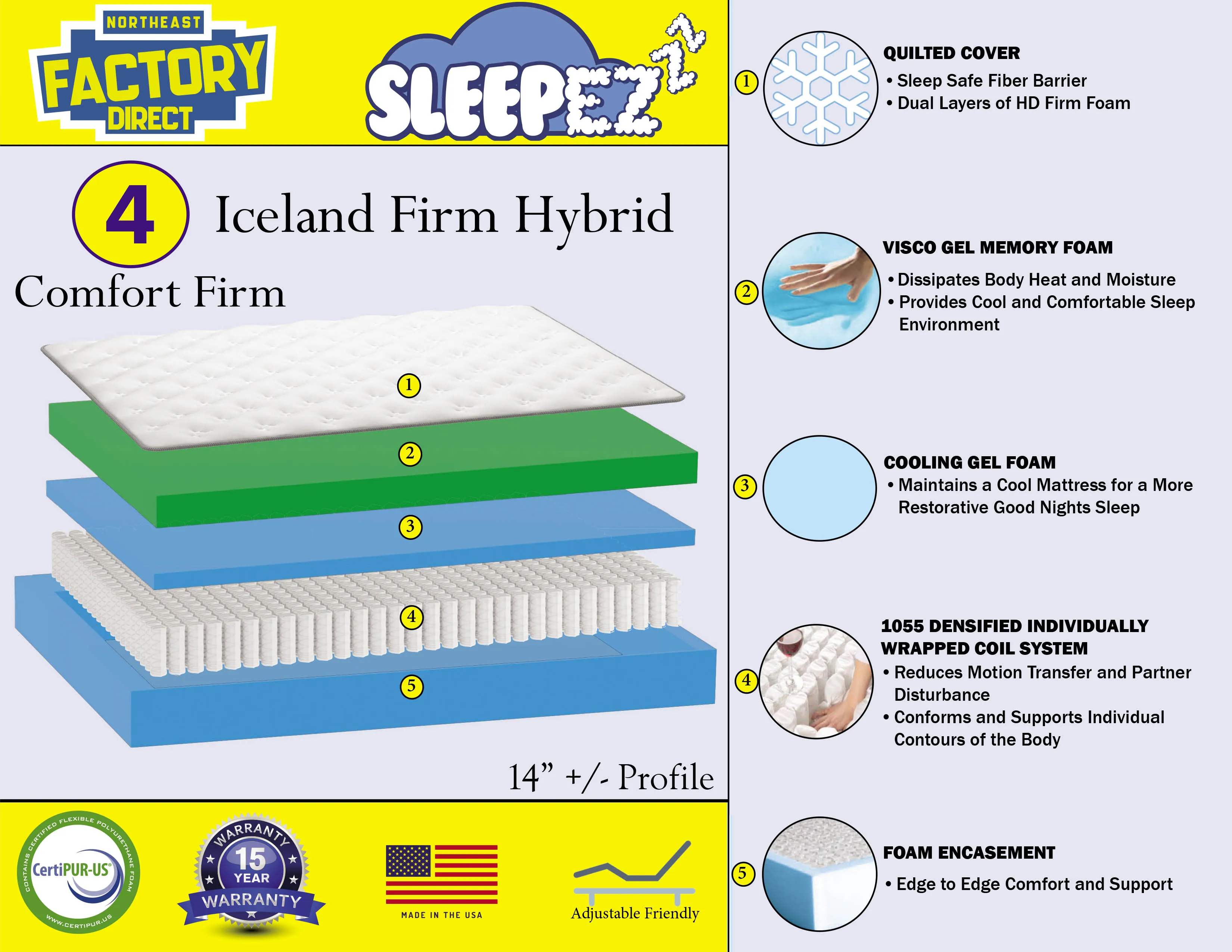The Iceland by SLEEP EZZzz is a high quality mattress in twin, twin XL, full, queen, and king sizes with hybrid pocket coils and foam for a firm comfort style.
