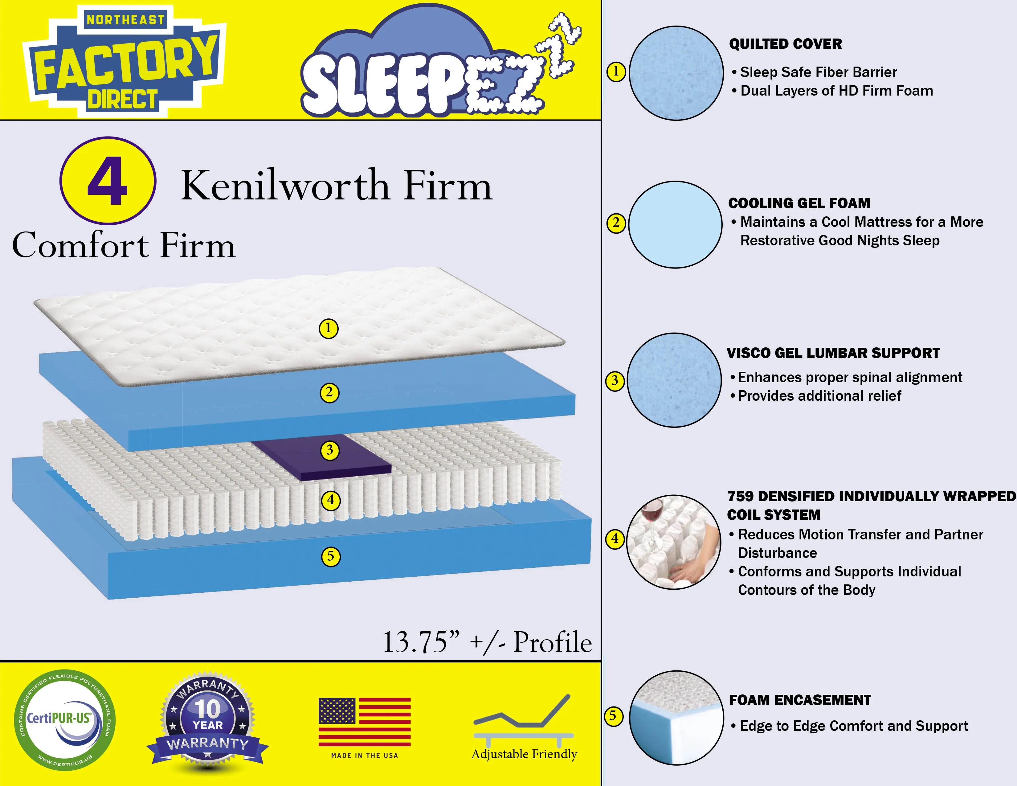 The Kenilworth Firm Mattress is designed for sleepers who want structured, comfort‑firm support with dependable stability and cooling performance. With a 13.75” profile and an adjustable‑base friendly design, this mattress delivers firm support while still offering pressure relief where it matters most.
