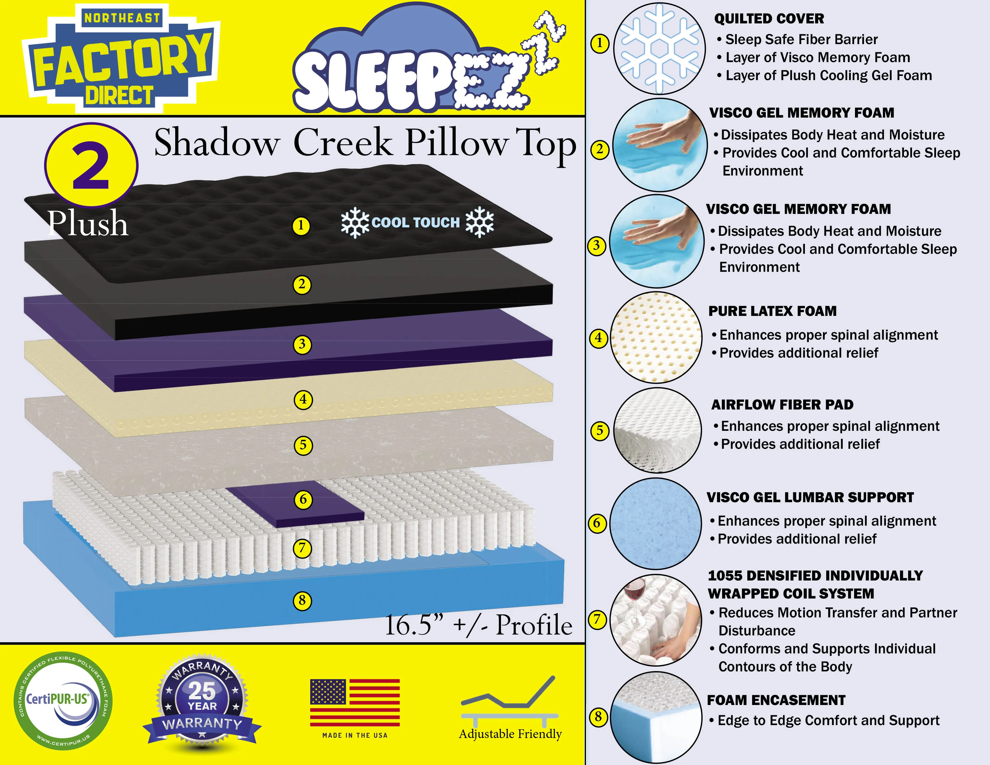 At the core of the Shadow Creek Pillow Top is a 1055 densified individually wrapped coil system, engineered to: